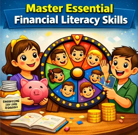 Build a strong foundation in financial literacy by learning essential money concepts such as budgeting, saving strategies, credit scores, debt management, investing basics, and emergency fund planning. This interactive quiz wheel helps learners of all ages understand real-life financial decisions in a simple and engaging way.